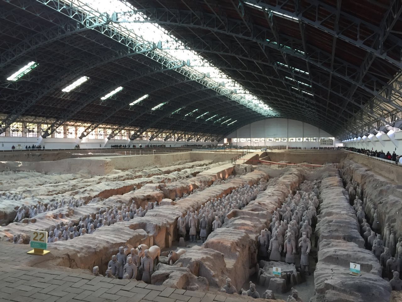 中午时分,我们到达最令人期待的兵马俑博物馆。兵马俑从1974年被发现至今,已经发掘了三个坑,局工作人员介绍现在已经发现了四号坑,并在规划中,我们也看到了四号坑的规划线,其位于二号坑和三号坑之间。在一号坑中我们看到很多武士俑,还有几乘战车和驾车马。这些武士俑面部神态、服式、发型各不相同,个个栩栩如生,形态逼真,排成三列横队。另外,在南北两侧和两端,各有一列武士俑,似为卫队,以防侧尾受袭。这支队伍阵容齐整,装备完备,威风凛凛,气壮山河,具有强烈的艺术感染力和视觉冲击力。