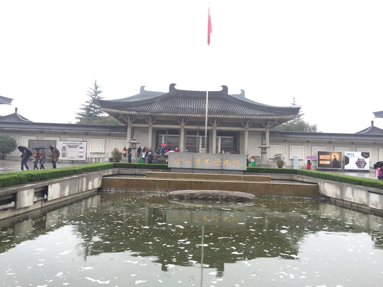 之后,我们直接步行到达慈恩寺,玄奘为保存由天竺经丝绸之路带回长安的经卷佛像主持修建了大雁塔。所以在慈恩寺南门立有玄奘立像以示纪念。此时雨势渐大,不待调整便进入寺内,准备登大雁塔。大雁塔有七层塔身,如今可见稍有倾斜。塔内空间并不算宽敞,尤其是楼梯间甚是狭小,拾级而上,总计249階。登上塔顶可见北面的喷泉不断变换各种形状,十分壮丽。而远远望去,烟雨梦中中可以饱览整个城墙之内的壮景,亦是十分美妙。