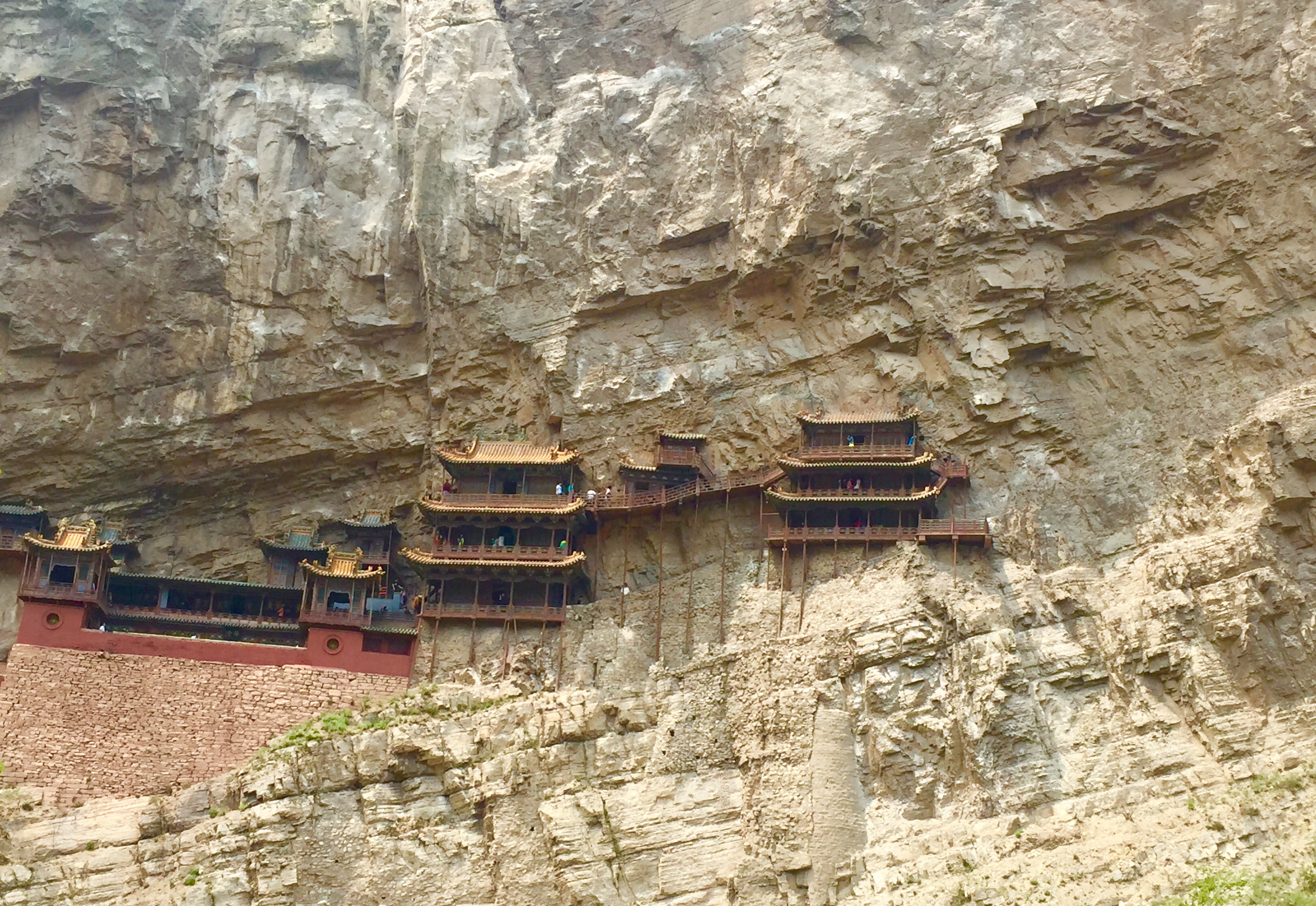 我们本次游学的最后一站为悬空寺,明王湛初有诗云:“谁凿高山石,凌虚构梵宫。蜃楼疑海上,鸟道没云中”,素有“悬空寺,半天高,三根马尾空中吊”的俚语,以如临深渊的险峻而著称。建成于1400年前北魏后期,是中国仅存的佛、道、儒三教合一的独特寺庙。 也因为它的高险,老师特意叮嘱恐高的同学注意安全,靠里侧走。北魏天兴元年(公元398年),北魏建都平城(今大同市),北魏天师道长寇谦之(公元365-448)仙逝前留下遗训:要建一座空中寺院,以达“上延霄客,下绝嚣浮”。之后天师弟子们多方筹资,精心选址设计,悬空寺于北魏太和十五年(公元491年)建成。唐开元二十三年(公元735年),李白游览悬空寺后,在岩壁上书写了“壮观”二字。悬空寺现存建筑是明清两代修缮的遗物。参观完毕,我们坐上公司大巴回到公司。