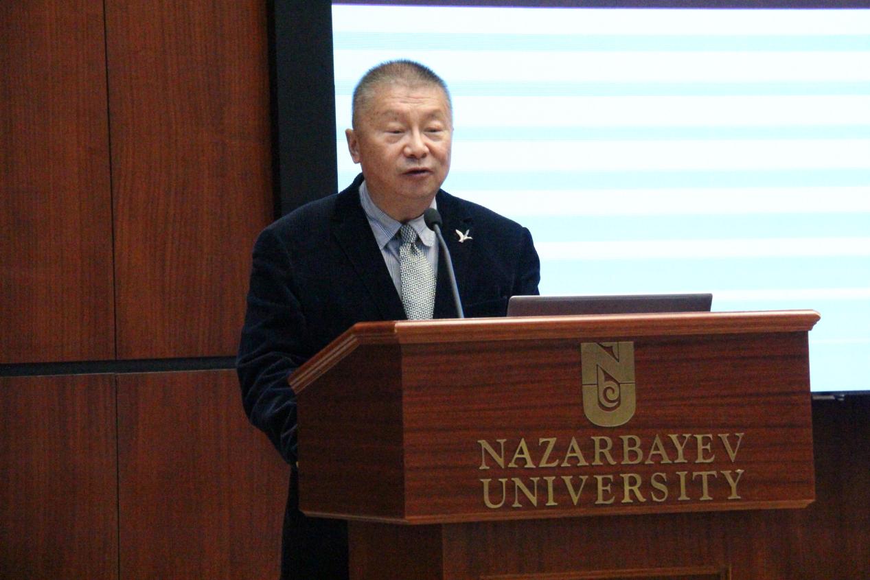 图2:李肖教授在哈萨克斯坦纳扎尔巴耶夫大学做“一带一路”纪念活动发言